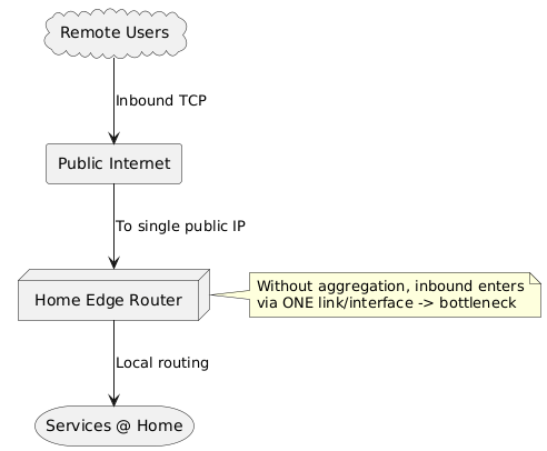 Outbound traffic is great, but what about inbound? Accessing a private cloud from anywhere—securely and with the same aggregated speed as outbound—posed a significant challenge. Typically, inbound traffic must come from a single IP address and be received by your edge router, which also has a single IP address. This setup means routing through one device or line with low speed, creating a bottleneck that can negate the advantages of aggregation. To address this, I needed a solution that connected inbound traffic over the same virtual aggregated line created for outbound traffic.
