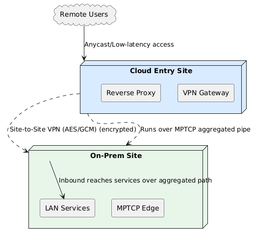 By leveraging hybrid cloud architecture, site-to-site VPNs, and MPTCP, I was able to build a VPN entry point in a low-cost cloud site. This entry point linked with my on-premises site via MPTCP. This setup allowed the cloud site users to access the on-premises infrastructure through the same aggregated virtual line. Additionally, the aggregation capabilities of MPTCP alongside the encryption and secure tunneling of VPNs created a robust and aggregated pipe for inbound traffic. This ensures high-speed, secure access to my infrastructure from any location. It wasn’t just a theoretical concept; I implemented the solution, ran extensive tests over two months, and achieved excellent results.