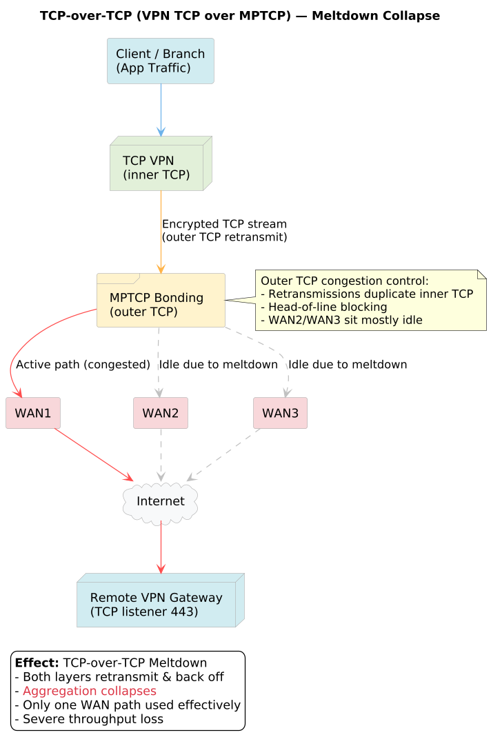 This leads to what’s called a meltdown: instead of scaling, throughput collapses, sometimes worse than a single TCP connection over one WAN.